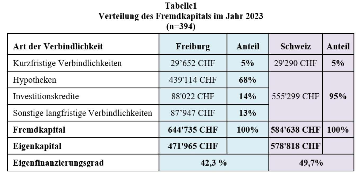 Dieser Rückgang entspricht einem Verlust von 28 % der landwirtschaftlichen Strukturen in zwanzig Jahren. Im gleichen Zeitraum sank die Zahl der Arbeitsplätze in der Schweizer Landwirtschaft von 193’179 auf 148’880, was einem Rückgang von 23 % entspricht. Trotz dieses deutlichen Rückgangs konnte der Agrarsektor seine Produktion aufrechterhalten. Diese Stabilität ist vor allem auf die Zunahme der durchschnittlichen Betriebsgrösse von etwa 15 ha auf fast 22 ha zurückzuführen. Sie ist auch das Ergebnis einer schrittweisen Intensivierung der landwirtschaftlichen Praktiken, die durch eine immer leistungsfähigere Mechanisierung und Fortschritte in der genetischen Selektion ermöglicht wurde. Diese Produktivitätssteigerungen beruhen jedoch auf erheblichen Kapitalinvestitionen in Maschinen, Gebäude, und Spezialausrüstung, deren Amortisation zwangsläufig langfristig erfolgt. So ist der durchschnittliche Wert des landwirtschaftlichen Vermögens in der Schweiz in den letzten zwanzig Jahren um rund 60 % gestiegen. Im Kanton Freiburg zeigen die Daten aus der Landwirtschaftlichen Buchhaltung eine ähnliche Entwicklung. Die folgende Tabelle zeigt die durchschnittliche Verteilung des Fremdkapitals im Jahr 2023, sowohl auf nationaler als auch auf kantonaler Ebene (n=394).