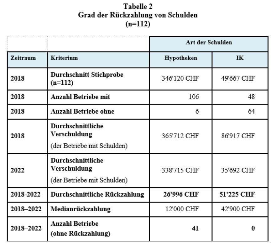 Dennoch weisen die untersuchten Betriebe bereits 2018 einen hohen Verschuldungsgrad auf. Der Durchschnitt der langfristigen Fremdmittel der Betriebe der Stichprobe (n = 112) belief sich 2018 auf 436’194 CHF, gegenüber 396’713 CHF im Durchschnitt der Freiburger Statistik für dasselbe Jahr (n = 425). Die folgende Tabelle zeigt die Entwicklung der Verschuldung der Betriebe der Stichprobe zwischen 2018 und 2022. Was die Hypotheken betrifft, so hat die repräsentative Stichprobe im Durchschnitt etwa 7,4 % ihrer ursprünglichen Schulden während des Berichtszeitraums zurückgezahlt.