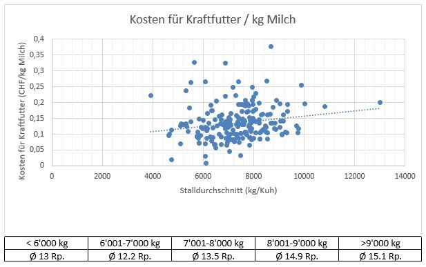 Kosten für Kraftfutter pro kg Milch in Abhängigkeit des Stalldurchschnittes. © Grangeneuve