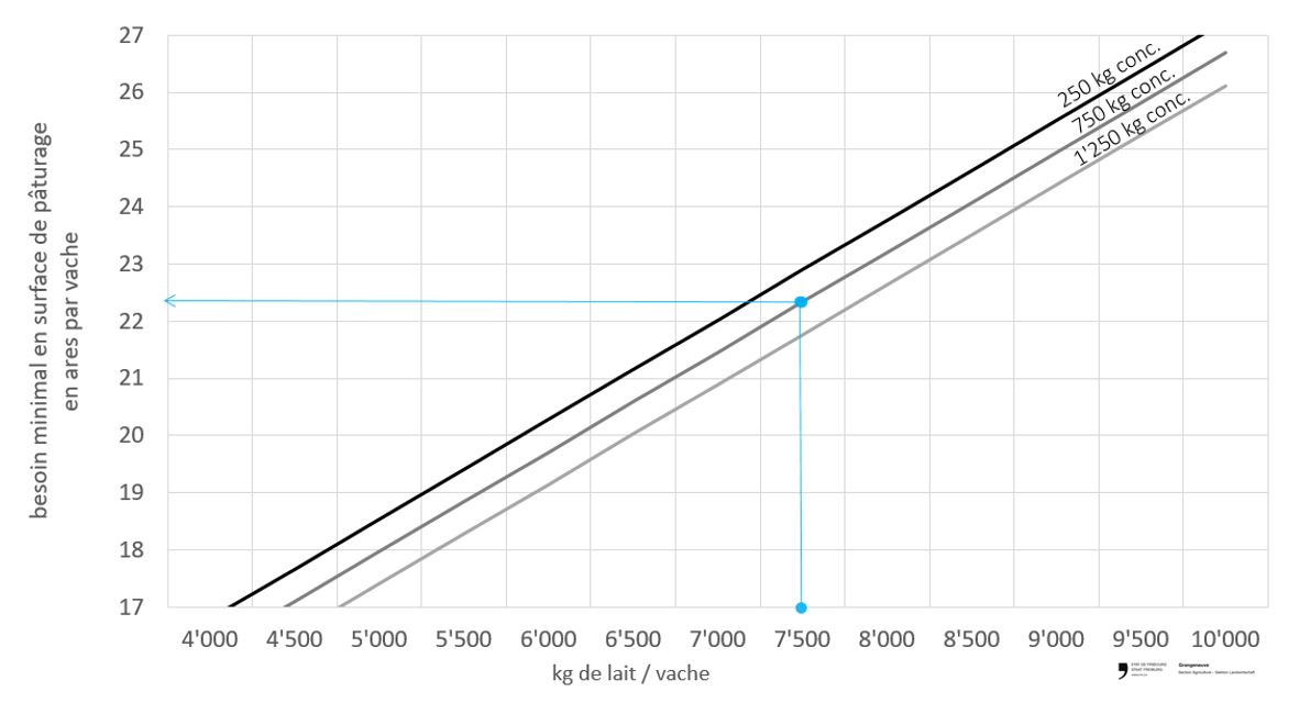 Selon les informations de l’OFAG et à titre indicatif, il faudra assurer l’accès à près de 23 ares de pâturage pour une vache produisant 7’500 kg de lait avec 750 kg de concentrés sur des pâturages de plaine à 100 dt MS/ha. Il en faudra plus de 30 ares si les pâturages ne produisent que 75 dt MS/ha en plaine.