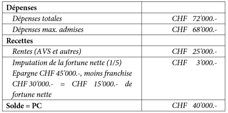 Tous les détails et d’autres exemples chiffrés se trouve dans le Mémento 5.01 Prestations complémentaires que vous trouverez facilement par une recherche sur internet. Signalons enfin que depuis le 1er janvier 2021, une fortune nette supérieure à CHF 100’000.- pour une personne seule exclut le droit aux PC.