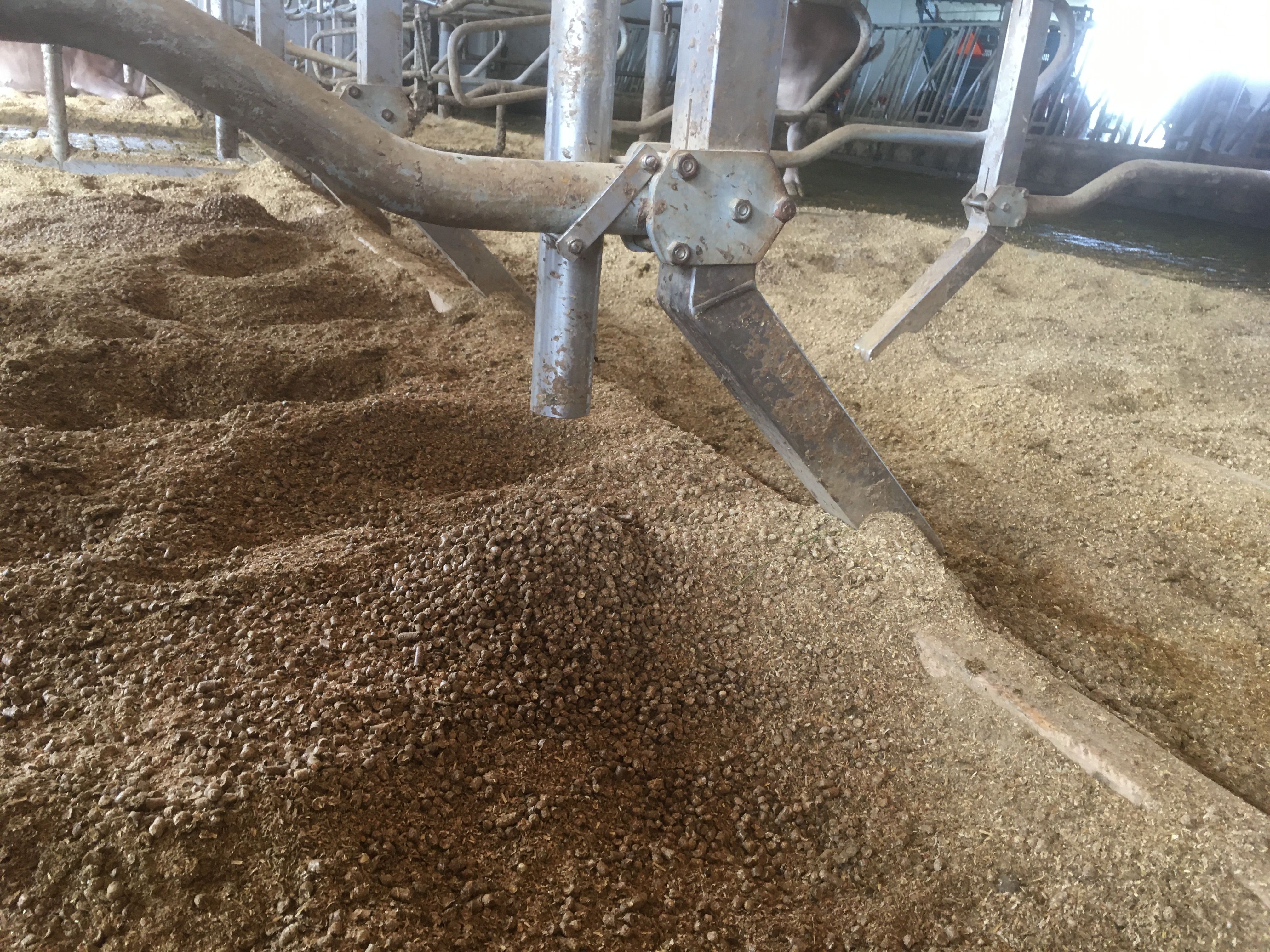 Stefan : Pas personnellement, nous paillons avec le chargeur de ferme et nous en sommes satisfaits. Mais j’ai récemment lu un article qui décrivait le paillage automatique dans les porcheries. Le système présenté fonctionne avec des bacs alimentés en paille hachée ou en pellets par des tuyaux. En Suisse, il existe déjà quelques installations de paillage automatique avec de la paille hachée entre les logettes. J’ai visité un système similaire qui achemine les granulés de paille directement dans les boxes. Regarde la photo (illustration 3) !