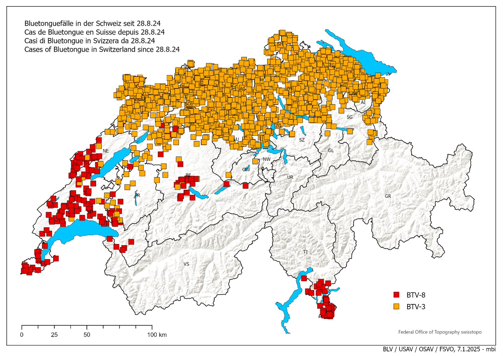 Le virus de la Langue Bleue est apparu cet automne en Suisse et a déjà fait de gros dégâts dans les exploitations touchées (diminution de la production laitière, fièvres, boiteries, retours en chaleur, avortements et morts d’animaux).