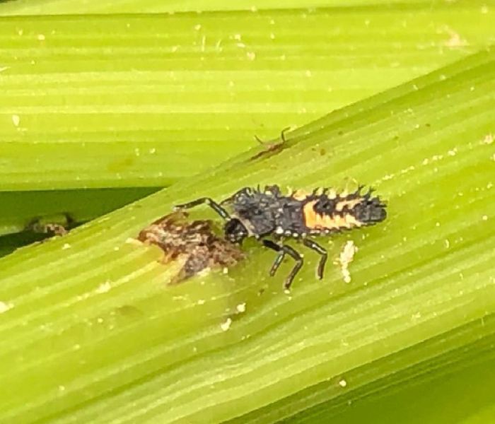 Dans certaines parcelles, le nombre de piqûres de ponte par plante est impressionnant (il peut p. ex. atteindre 200 piqûres !). Il faut toutefois relativiser leur impact sur le rendement en sucre. D’une part, parce que 70 % des oeufs n’écloront pas, car ils peuvent être détruits par des prédateurs naturels (p. ex. une larve de coccinelle, voir photo ci-contre). D’autre part, si le feuillage est vigoureux, les larves se contenteront de se nourrir « uniquement » du pétiole et termineront leur cycle à l’intérieur de celui-ci, sans aller creuser dans le collet. Cependant, si la plante a subi un stress hydrique important, p. ex. dans les parcelles à sol superficiel, des dégâts dus à la pourriture pourraient être à craindre en automne, si les galeries dans le collet sont infectées par des bactéries ou le champignon Rhizopus. Il a été estimé que sans présence de pourritures, les galeries creusées par les larves dans les feuilles (pétioles) et les collets peuvent engendrer des pertes pouvant atteindre 5 à 7 % de rendement.
