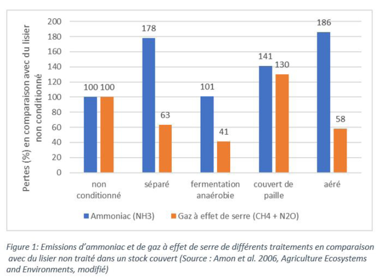 Néanmoins, les émissions de gaz à effet de serre peuvent être réduites de manière importante lors du stockage et de l’épandage (Figure 1).