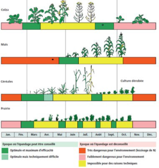 Pour les céréales, des apports de lisier en automne devraient être évités, car la céréale prélève au maximum 20 kg/ha N jusqu’à la fin de la période de végétation et ce prélèvement est normalement couvert par l’azote résiduel du sol. En fin d’été et en automne, les engrais de ferme peuvent être épandus avant le semis d’engrais verts ou de dérobées.